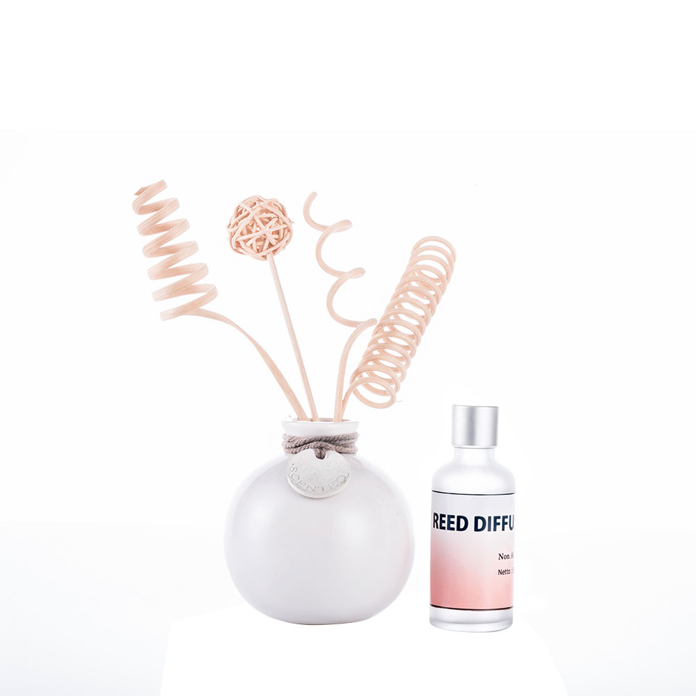 Pengharum ruangan dalam wadah keramik menggunakan rotan untuk menyerap cairan pewangi & menyebarkan aroma wangi disekelilingnya. Dijual dalam bentuk accesory set, termasuk dengan pewangi.